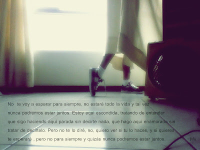 Esa tarde de otoño, juntos, los dos sentados en la banca del parque, la misma en que tengo tantos recuerdos contigo . Te vi, tu me viste, sonreimos, y dije - que frío . Mi única excusa para escapar de ese silencio horroroso que nos tenia atrapados. Sin ninguna palabra estiraste tu brazo y en un instante ya te tenía abrazado, fué tan tierno, tan romántico. Me agarró la mano, me sentí tan nerviosa, temblé. Como la última vez que nos tocamos, hace muchos meses. En esos instantes, en esos cinco minutos, sentí ternura, felicidad, sentimientos que nunca sentí, me latía el corazón muy muy rápido, sentía que iba a caer desmayada.Y me soltaste. Me sentí mal hasta que me tocaste la mejilla, me hizo temblar más; te acercaste lentamente a mi y cerré los ojos . Solo recuerdo haber sentido unos labios dulces tocando los mios, azúcar. Y tu mano suavezita. Y mis ojos abrirse de nuevo y encontrarme en mi habitación sudando, temblando y mirando el reloj 3:00 am ; un sueño me dije. Lloré , no tuve nada más que hacer que dormirme denuevo .
